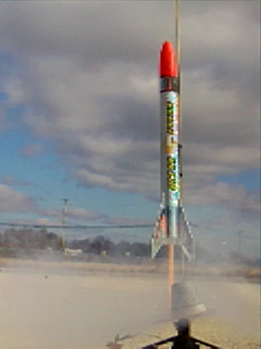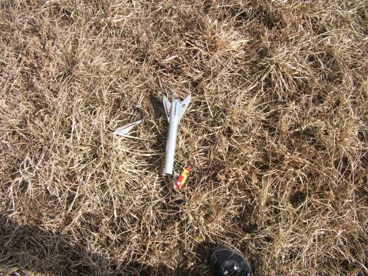 Launched rocket on B engine. Good flight. Nosecone and rocket body were both visible throughout flight and landed about 10 yards apart from each other. Forgot to start up the Speed Freak nosecone computer. Parachute deployed, but did not open. Rocket body crashed and broke one plastic fin at the base. Cannot be repaired.