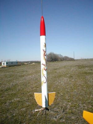 Since the nose cone is painted red and the body tube and fins are painted white, I painted them separately before installing the shock cord. Only the leading edges of the fins were rounded. The fin decals were easily cut out but the Dragonfire takes a little more time, as I like the cut to follow the outline of the decal. There was no way to get it to lie down like the picture on the kit though. Even though Don provided an extra dragon decal with the kit, I proceeded to immediately shred both of them trying to wrap them around the tube. He provided me with another full set, but I still managed to tear the next one in about five places just trying to get even a small twist partially around the body. My hands just aren't steady enough to pull something that thin along. They were so thin I even tore a piece in two of the fin decals. It still looks great though. I could have tried again, but didn't think I'd really do any better with another try. Next I applied a couple of coats of Future Floor Wax to protect the finish and improve the shine. She's ready to throw a few fireballs!