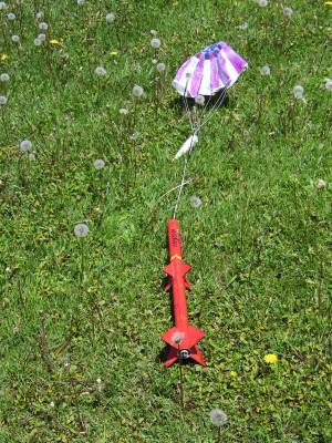 Good boost off pad with rocket with rocket going almost out of sight. Book says maximum altitude is 401'. Looked every bit of 400' to me. Parachute deployed just past apogee and decent was good. Rocket landed with no damage about 3/4 the way across the park. Roughly 300-400' from pad.