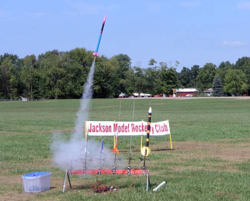 Rocket weather cocked as it came off the pad but gained good altitude. Parachute ejection was a couple of seconds after apogee. This is where the trouble started. Ejection charge melted through shock cord and rocket separated into three pieces. Nose cone and main body of rocket came down hard and fast while payload section drifted away under parachute never to be seen again. Had help in search for nose cone and was finally recovered by one of the kids at the field. Tip was broken off. Main body tube recovered intact. Rocket will be repaired and flown again but will no longer have a payload bay (the black section) unless I find a replacement tube.