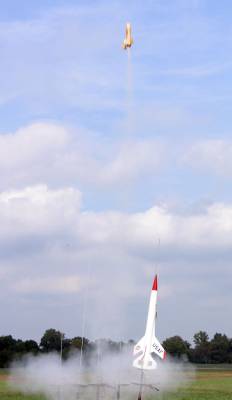 Maiden flight for this one as well on a B6-4. Another fast one off the pad with a good high flight and parachute deployment just past apogee. Rocket hit the ground a little to hard on impact as recovery showed a crack in right rear rudder. Will strengthen it with super glue and fly again.