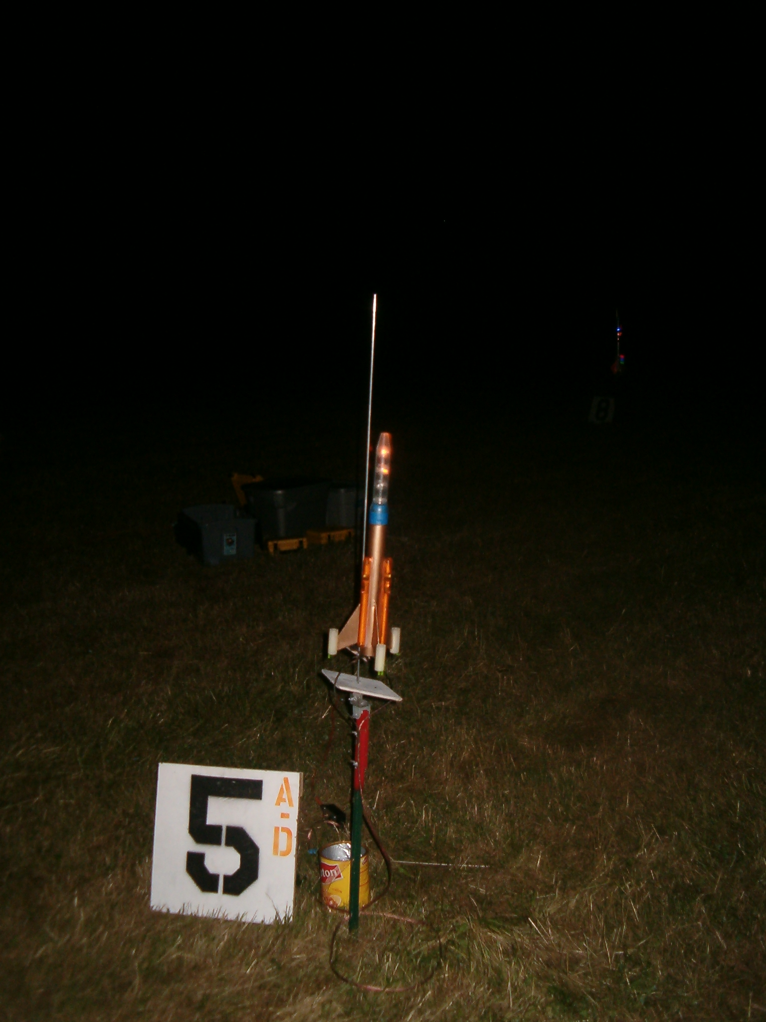 Scratch built night rocket from left over parts supply. Rocket features three 7-way flashing light wands attached to the main body. Four 3 color flashing light balls in NC, and 3 night fishing glow sticks in each of the fin tip engines(adding machine rolls) to illuminate them.