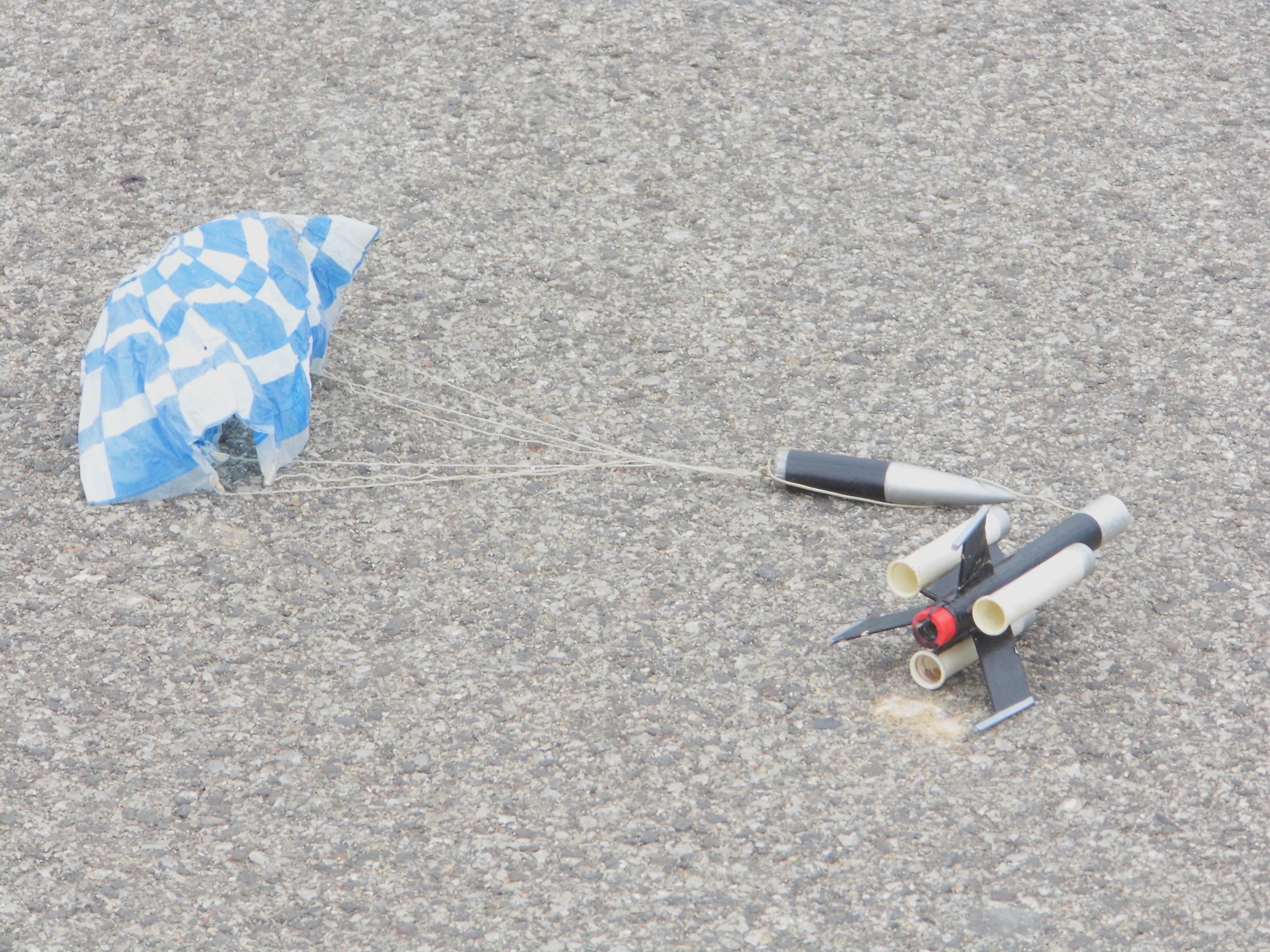 Grabbed the 13mm adaptor and loaded it with an A10-3T. Low altitude flight with parachute at apogee. Good decent but hard landing. Broke one wing strut and and re-broke a fin that was broken in the past. Will be repaired and flown again.