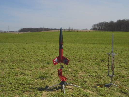 Maiden flight. Rocket was loaded with an Aerotech G71-7R reload. Also onboard was my new Jolly Logic Chute Release system set for 300'. It took 3 igniters before it finally lit. Once lit, the rocket screamed off the pad to around 600+'. Delay was a bit long but ejected everything. Chute release cycled at 300' and worked fine. Altitude set to low. Rocket was still swinging back and forth when it landed on its side. No damage but hit harder than I would have liked.