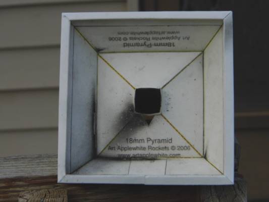 Rocket took off straight up but at about half way it kicked the motor. Motor continued upward at a 45 degree angle for about another 50 - 100 feet while Pyramid nose over and dropped to the ground landing 3 feet from pad. Some black scorching on bottom of Pyramid on recovery.