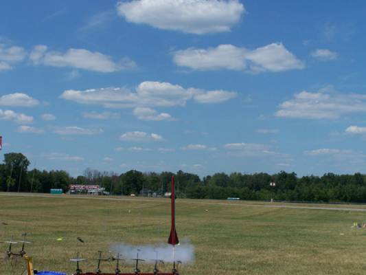 Second flight of the day for this rocket. Weather cocked a bit due to wind but roared off pad with good chute after apogee. Rocket recovered with slight damage to underside right wing (broke off a pod and cracked wing). Will be reairable.