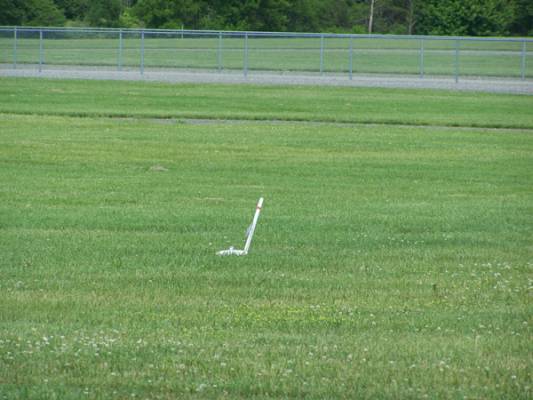 Good Launch with rocket flying straight and true. Boost tube ejected properly and wing snapped into place as designed. However, rocket appeared to be nose heavy inspite of the pre-testing I did to balance it. She nosed over and did a lawn dart trick which sheared off the tail and elevator assembly, cracked the wing at the swivel point and put a small crease in the body tube. Rocket is repairable.