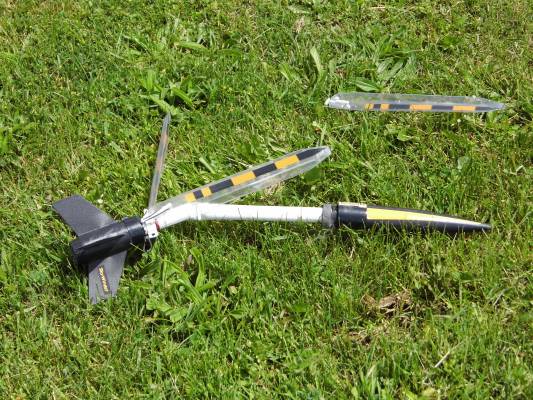 Good boost was all. When ejection charge fired one blade did not open. Rocket came down hard and bent center tube again. Also popped a blade on impact. Will need to replace or repair tube again and install new rubber bands in blades.