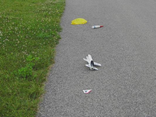 I've been wanting to drag race these two for some time. They both left the pad at about the same time and Snarky climbed straight and true. I didn't see the parachute eject because I was watching Jr. veer from its anticipated flight path. On recovery I found the tail sheared off. Will repair and fly again. BTW: Snarky hit a bit higher altitude and hit the ground first.