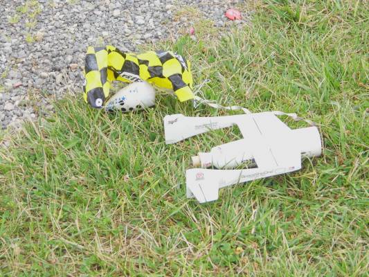 Nice straight flight with parachute deployed at apogee. Fast spinning decent but no damage on recovery. Need to replace parachute with one that as a smaller spill hole as the current one is to large.