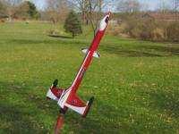 Maiden flight. Unfortunately the motor man didn't show up so couldn't buy any 29mm motors. Grabbed my 24mm adaptor and loaded it with an Estes E12-4. Rocket wobbled on take off due to not having a 1/4" rod but straighten out half way up. Biggest rod they had was 3/16" and I don't have rail buttons ... [More]