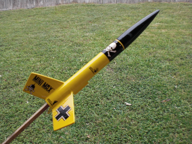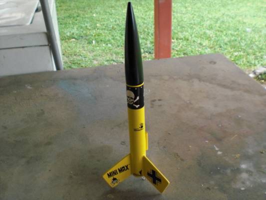 Going thru my spare parts box and found a set of Mini max fins and balsa nose cone, so I grabed spare 6.5" BT-50 and added a standard sized 18mm engine mount and came up with this... To set my custom made Red Max rockets from the stock one's I paint them Yellow... For recovery i use a 30" crepe paper streamer and 25" of 1/8 braided eleastic instead of the estes rubber shock cord.
