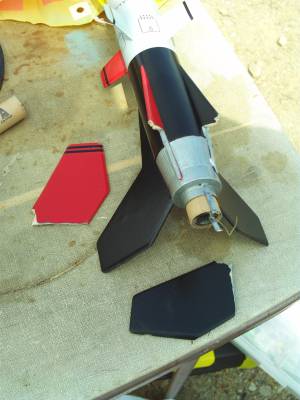 Hung up on launch rod. Shallow arc over and crash just as ejection charge went off. Broke off two fins. To be repaired.