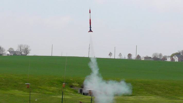 This is the first, virgin flight for this newly-built model. I had to cross my fingers that the erratic wind gusts wouldn't destroy her. It is a tall and heavy model, as much as a C6 can possibly handle. No question I would opt for a -3 instead of a -5 delay. This particular C6-3 burned for 2.1 seconds and peaked at a respectable 5.5 Gs of acceleration, averaging only 1.5 for the burn - nearly as low as can safely be done, since a slow liftoff is prone to tipping into the wind. There was no gust at liftoff and the slow liftoff was a thing of nervous beauty.