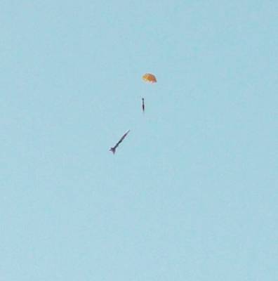 The delay grain burned a little long - 3.4 seconds, giving the Striker enough time to turn over and fall only 7 feet in the final full second before ejection. The Quest parachute opened well at 290 feet, and the rocket descended at 9 mph - a little slower than any previous flight. It landed nearby in the grass 26.6 seconds later. Inspection showed a fin cracked and almost completely separated at the root, even though it was a slow descent and a soft landing in grass. I suspect that the fin repair from the previous flight with no parachute was not repaired very well.