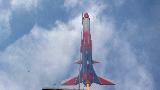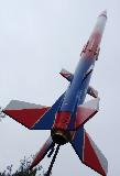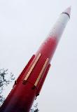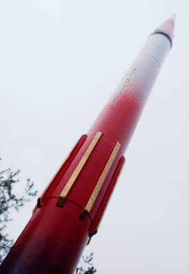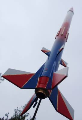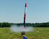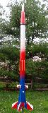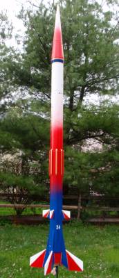 The Quest Striker AGM is a simulated military missile. My particular rocket was modified with a 3.5" payload that stretches it to over 30 inches long, and painted to an entirely different red-white-blue scheme featuring some gold trim lines. Another modification was started by the shipping company. The body tube was damaged in the center, so I wrapped it with a heavy paper shroud and then strengthened the body with eight basswood strakes that looks more like it was meant to be a design feature instead of a patch-job. To hide it in plain sight the strakes were painted gold. It looks like it was painted more for an air show and not like an AGM missile. I think with this model I have finally learned that models of this size and weight (30” and about 5 oz.) should have a 24mm mount. The 18mm motors that are affordable are just not powerful enough for satisfying altitudes. I can get about 300 feet on a C6-3 motor though, so it's high enough. This should be strong enough to fly with a composite D10 motor. This rocket has flown higher than the Washington National Cathedral and the US Capitol in Washington, DC.