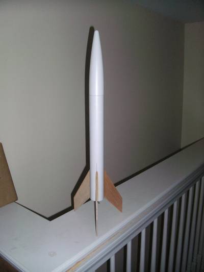 Finishing was started with Valspar primer, followed by two coats of thinned Elmer's Fill & Finish and copious amounts of sanding to kill off the tube spirals and balsa grain. The boby itself was then sprayed with Valspar gloss white, then one fin and a section of the body tube next to it was sprayed with Valspar gloss black. A thin stripe was masked off running from the fin up the side of the body tube and was also sprayed with the gloss black. The nose cone was sprayed with Valspar Cherry Red gloss. The decal was then given to a friend whose first attempt at applying his decal ended in tragedy.