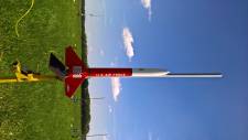 This is a BT-70 sized upscale of an Estes Teros. The balsa nose cone and decals are from Excelsior/Roachwerks. It uses a 29mm motor mount, with an Estes plastic threaded retainer and a 24" nylon chute.