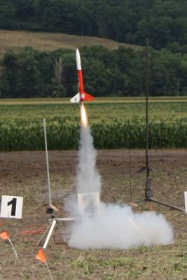 This is a BT-70 sized upscale of an Estes Teros. The balsa nose cone and decals are from Excelsior/Roachwerks. It uses a 29mm motor mount, with an Estes plastic threaded retainer and a 24" nylon chute.