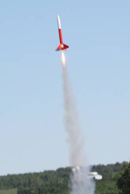 This is a BT-70 sized upscale of an Estes Teros. The balsa nose cone and decals are from Excelsior/Roachwerks. It uses a 29mm motor mount, with an Estes plastic threaded retainer and a 24" nylon chute.