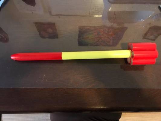 Tube rocket configuration with red and yellow paint scheme. Using 10" thin-mil x-shape chute and Top Flight chute protector.