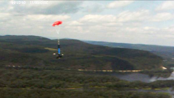 The Bandit HD booster returning to the launch field, photo from 650 feet.Not really over the river, but a few hundred yards to the east of the Sesquahanna River in Pennsylvania. The steep hills of the west shore can be seen in the background, under that are several large islands in the river. |