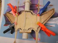 This rocket has lot’s of wood.Sanded and filling took seemed to take forever.The deadline was approaching and although I wanted to do more filling I had to get thing painted.I painted the main wing section without the laser cannons mounted and attached them later.The body, main wing section and laser cannons were painted with Testors Model Masters White Primer.