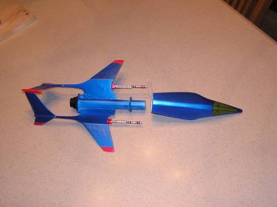 I masked and painted the Createx Pearl Red, then the Createx Pearl Blue.Next, I painted the dowels with Model Master Silver and handed painted the rings with multiple colors.I attached the laser cannons with 5 min epoxy and clear coated the entire rocket.