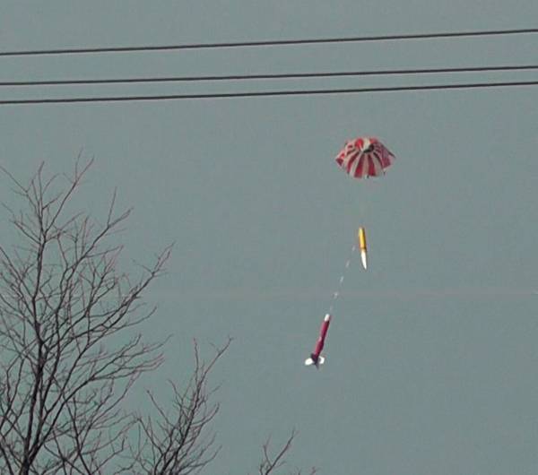 The Estes Aero-Hi safely avoids wire and tree to return its Iris payload.Alright, it wasn't really close at all. It is just the perspective obtained by using a very long focal length lens. It was actually hundreds of feet in front of those hazzards. ...but that was not the case in the following week! |