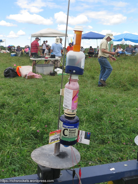 Rocket built from medicine bottles and boxes. Intended as a night flyer with microprocessor-controlled LED array but electronics are not complete.