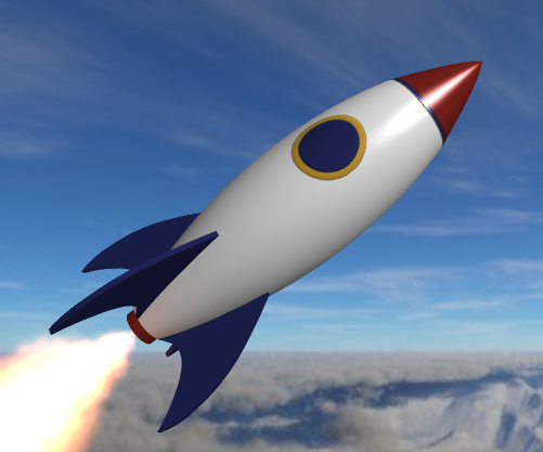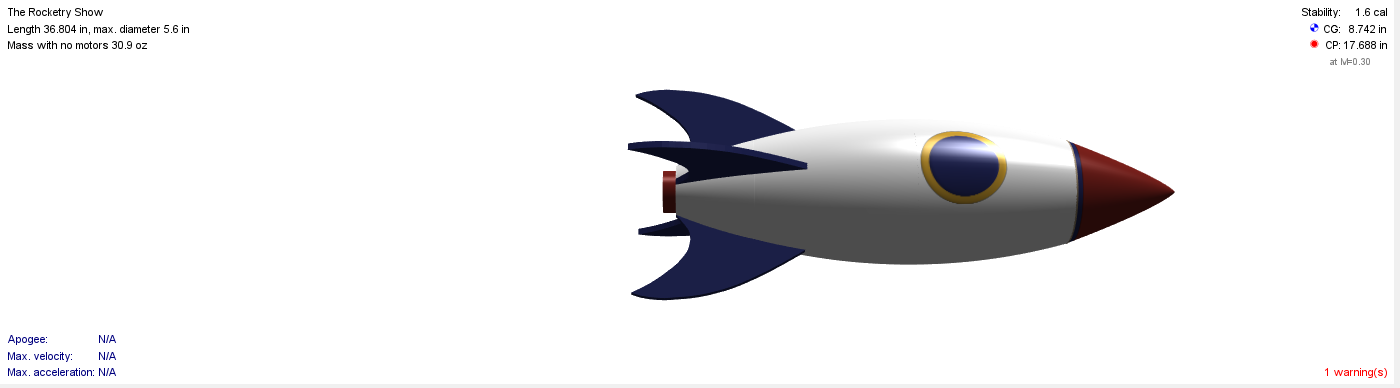 This render was a balance between performance and appearance. My intent was for the rocket to look as much like The Rocketry Show logo rocket as possible, while still having a proper flight sim in OpenRocket.