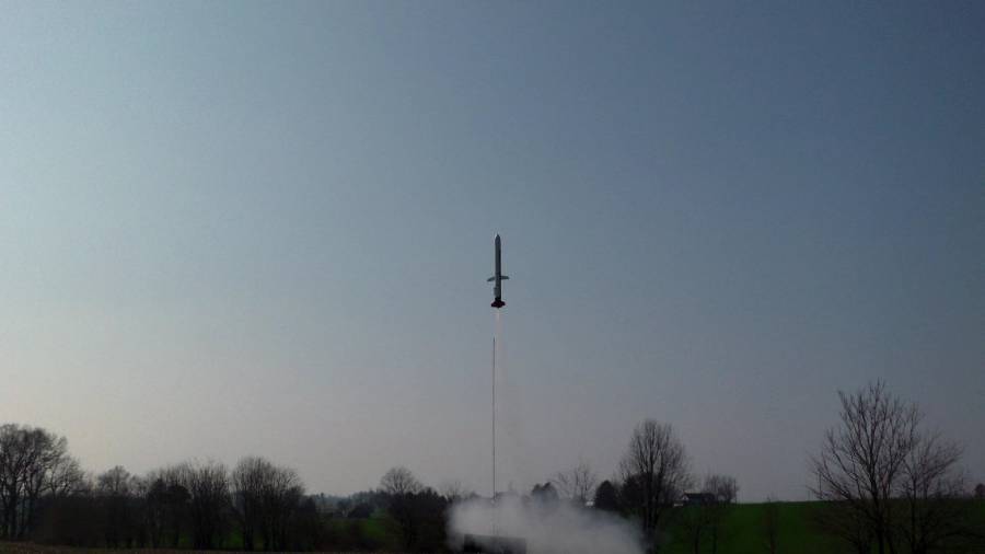 Late afternoon on a clear and calm day, the Tomahawk leaves the 4-foot launch rod. This rocket completed a half-turn at this point, and continued to rotate clockwise (from the bottom) as it flew out of the frame. The flight was straight and true.