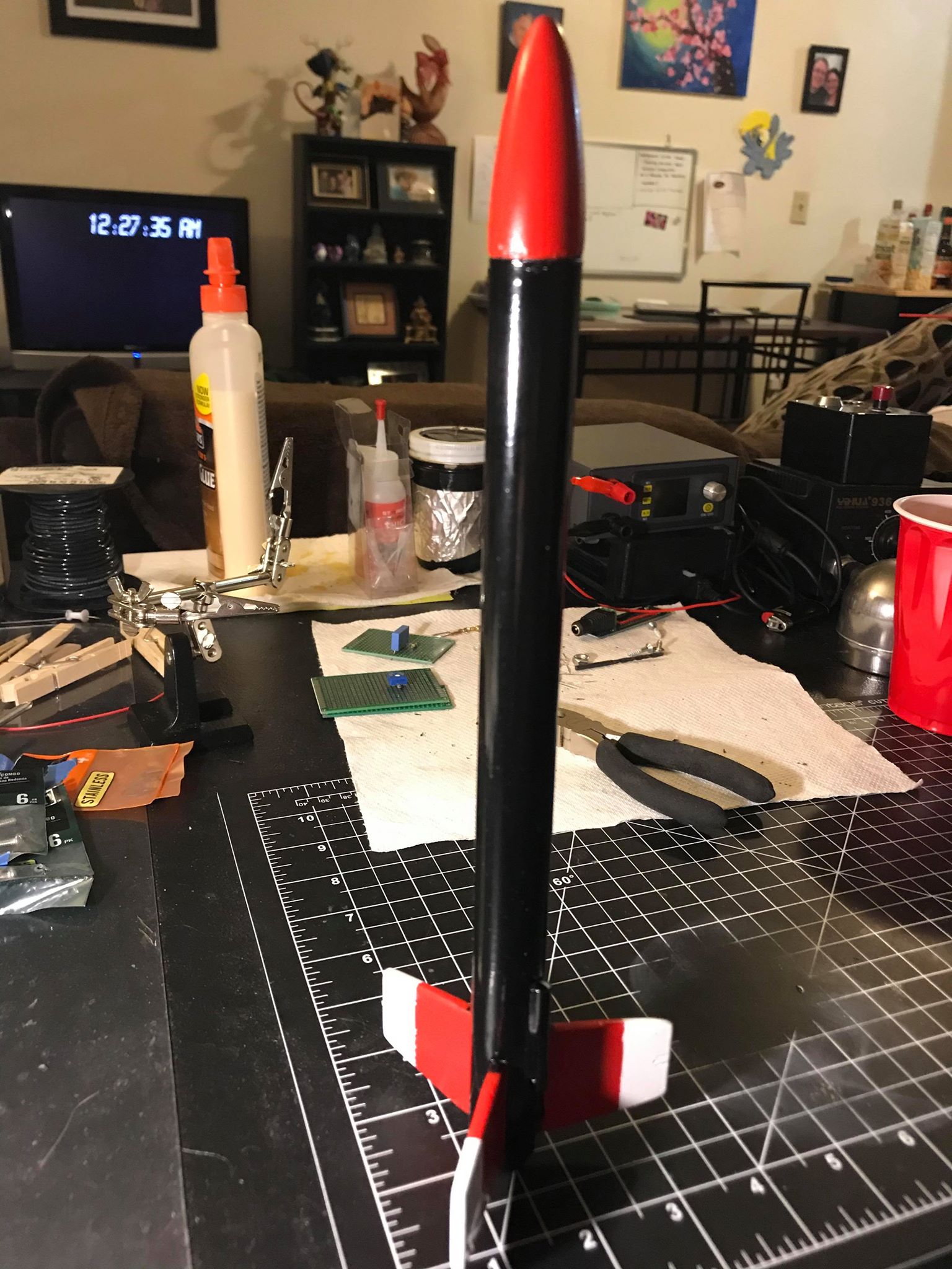 Simple 13mm kit, balsa fins, dead simple. Painted black and red with white fin-tips.