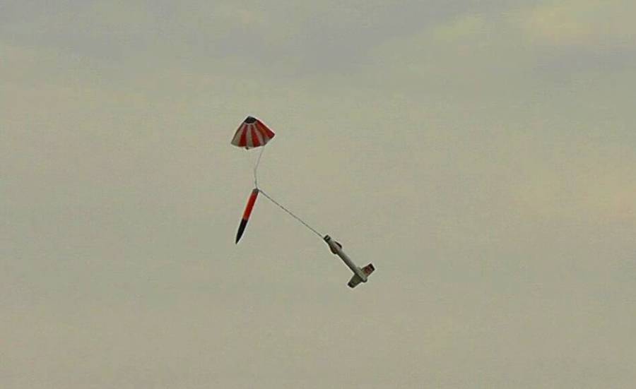 This parachute is from the original kit. It seems to take on a different odd shape every time it is deployed, but somehow it slows the rocket down anyways. If it ain't broke, don't fix it.