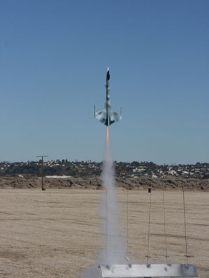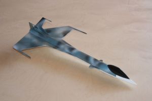 Brief: Single stage futuristic, jet fighter styled model rocket. Construction: Single glassine wrapped paper body tube, balsa nose cone, two main "wing" fins, two "vertical stab" fins, two canard fins, and two rear sub fins. Carved balsa canopy. Standard modroc motor mount with 2 laser cut black fiber board centering rings and 24mm paper tube w/ engine ...