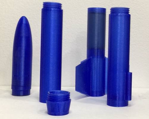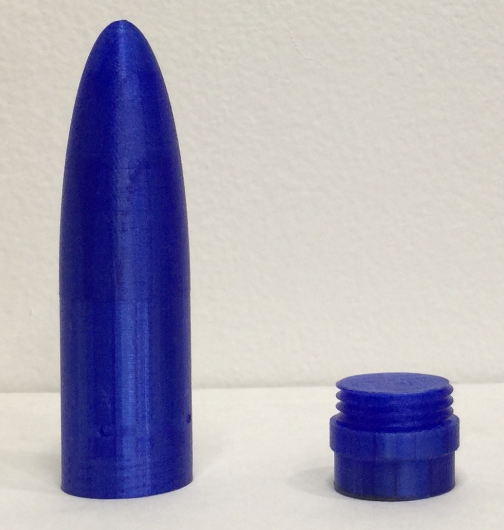 3D printed in PLA in segments. The segments screw together to allow making changes in the rocket setup. Designed for 18mm motors with a small air pocket around the motor (ID of tube is 22mm). The boat tail and engine block with flanges hold the motor in place. The nose cone (elliptical) and payload bay are a single piece with a screw in cap for attaching recovery device and shock cord.