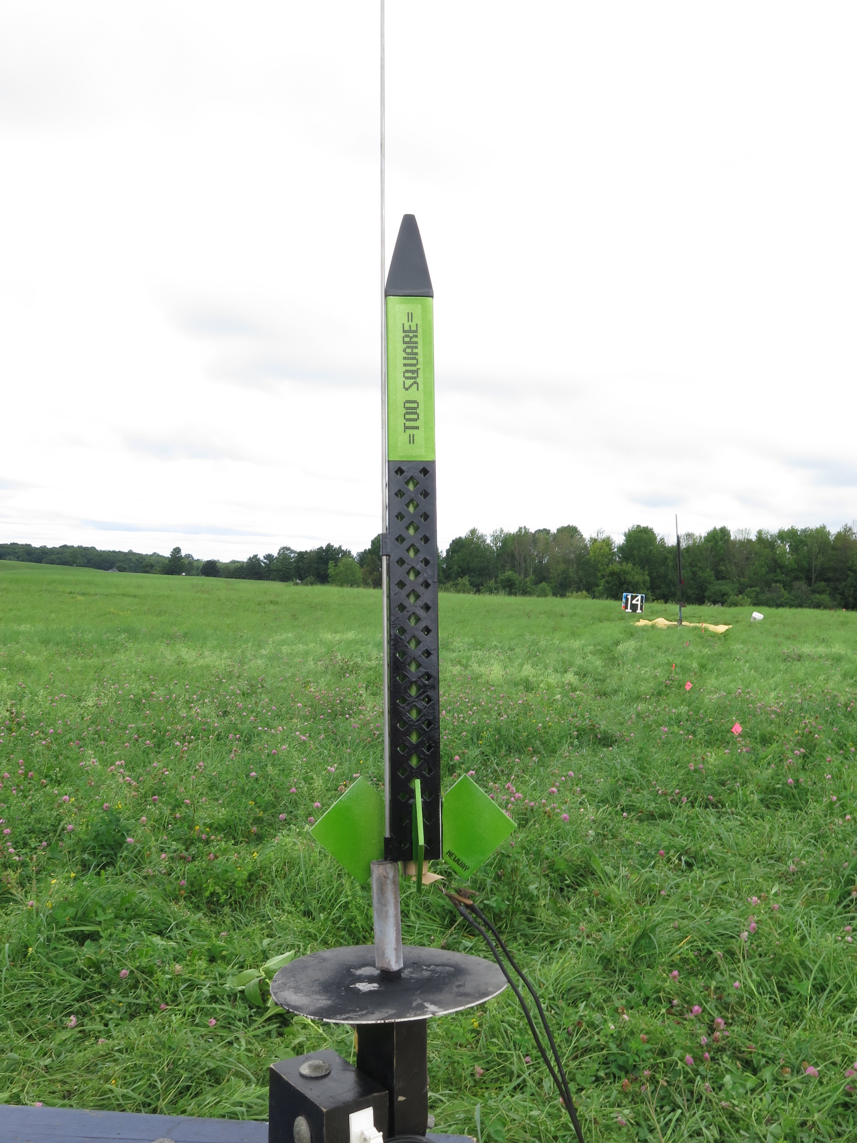 I had a certain amount of misgivings about launching a green and black rocket on a field with as much high grass as this, but recovery wasn’t a problem; it was within sight near the flight line. (In fact all day the wind was a little heavier than I like, but it was pretty consistent, blowing things parallel to the flight line with rockets often landing close to or over the line, but well downwind of the spectators.) The fluorescent green chute helped, too. Anyway, the Too Square did well on a C6-3.