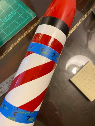 The trick for the 1969 Big Bertha is that the width of the stripes on the rocket are 1/9th the circumference of the body tube. That’s it!