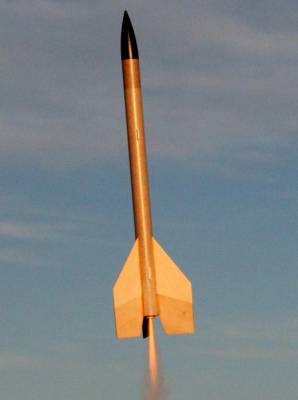 First flight of my nekkid BT-60 upscale Estes Beta. Gap staging worked fine...booster popped a fin on landing. Sustainer recovered by 18-inch nylon chute undamaged. Nice flight.
