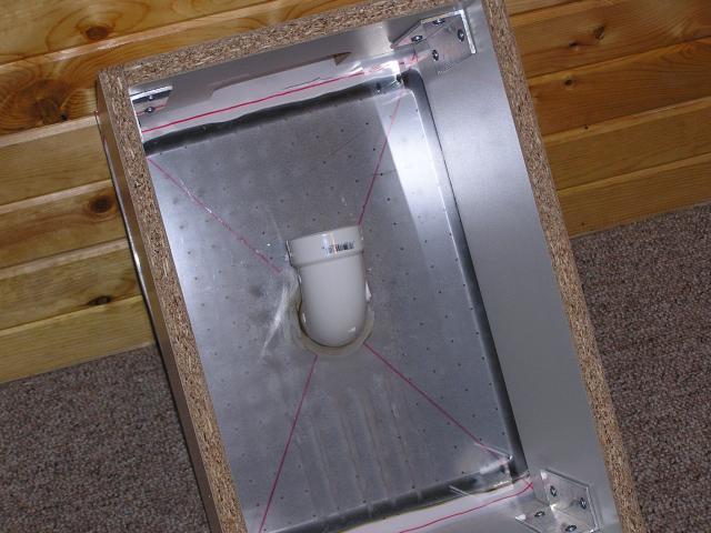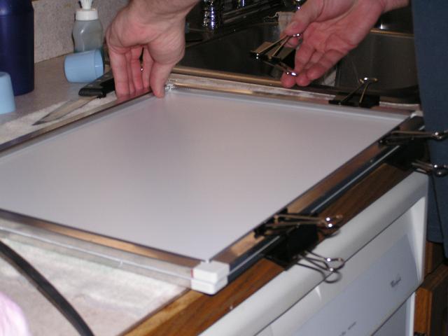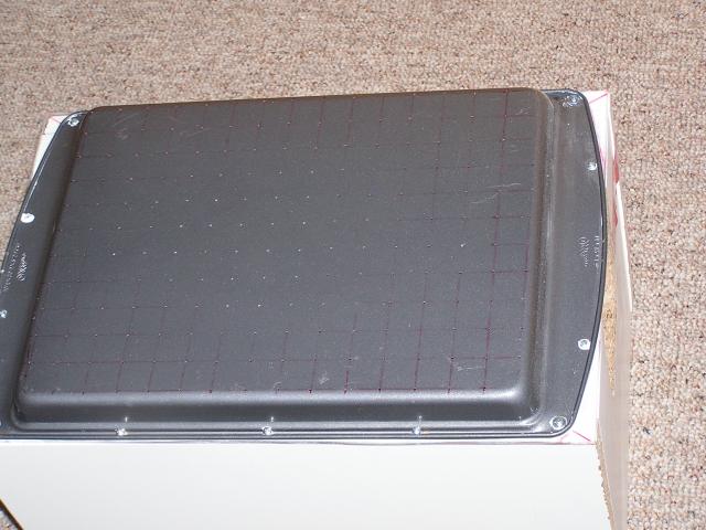 Next, drill about 2" hole in the center of the plexi-glass sheet. Then glue the PVC elbow over the center of the hole so that the elbow is pointing out toward one end of the plexi-glass sheet. Next, assemble the particle board into a box using the aluminum angle iron. Cut a clearance hole or slot in one end of the particle board box for the shop-vac hose. Now test fit the box, plexi-glass sheet, and cookie sheet. The slot in the box should align with the elbow mounted to the plexi- glass. Mark and drill the mounting holes through cookie sheet and plexi-glass into the box. Next put a thick bead of silicone caulk on the edge of the cookie sheet then lay the plexi-glass sheet over it making sure the cookie sheet and plexi-glass seal. Mount this assembly to the box. Finally, assemble the 2 screen frames making them slightly larger than t he cookie sheet.
