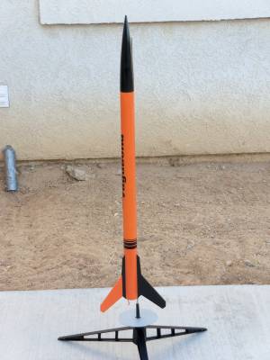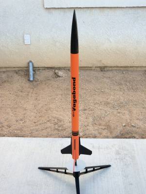 Estes Vagabond. Replaced stock shock cord with Kevlar. No other mods. Painted with Krylon Pumpkin Orange and Walmart Gloss Black over a base coat of Walmart Gloss White.