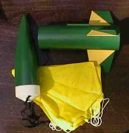 comes with an 18" bright-yellow rip-stop nylon parachute, a 36"