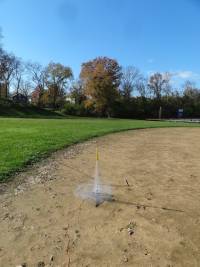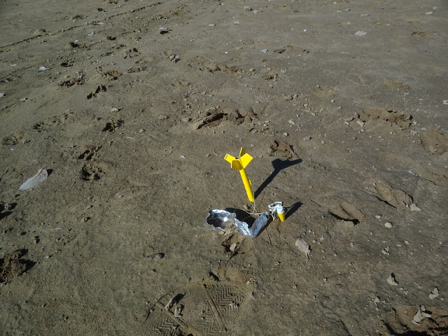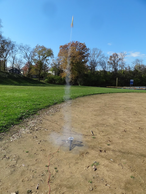 Only one flight so far, just to test the waters.  You may have heard that I fly on a small field, so minimum diameter rockets need calm days and the smallest possible motors when I'm flying.  On the chosen day I was lucky enough to have an almost complete lack of breeze, but previous flights left me confused about my engine choice.  A lackluster 1/2A flight with a slightly larger rocket caused me to choose another 1/2A for an Estes Screamer that flew just before the Vector.  The Screamer, a poorly built Ebay example, would have been gone on a normal day, which led me to choose a 1/4A for the Vector flight.  This was obviously the right choice as the flight was plenty high for the field, straight up, thermonuclear ejection charge, and straight down.  It landed on a damp bit of the infield and stuck the landing.  Twice.  Both the nose cone and body tube wound up sticking straight up from the mud.  Very cool, I think.