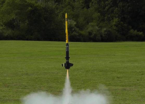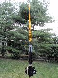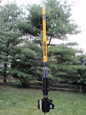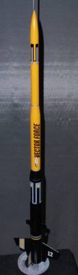 The Vector Force: The Vector Force is a modern Estes kit. This was my first model I made as a BAR. It had very good quality balsa fins on my kit, thick and sturdy. You can see the design is inspired by air defense missiles. It is rather tall, but somewhat heavy because of the two reducers. Because it has two reducer stages it has two separate payload tubes. Estes tells you to glue the payload tubes, but why? Good idea if you want to be sure the rocket doesn't separate in flight, but why waste two very nice payload bays? I just make sure they are always good and tight with some masking tape. Mine is painted school-bus yellow and gloss black to better match the included decals. I added about 3 heavy coats of clear coat for a really deep shine. String stability tests with a C motor required about 20-ish grams of nose weight, but now it flies really straight up - provided there is little wind. The top payload tube has vent holes for a barometric altimeter. I've recorded flights in excess of 400 feet with C6 motors. This is my current go-to flagship rocket. I have tried some test flights with composite D engines, to see if I could kick this puppy past 1000 feet. It sure did! In the process, the shock cord was torn out from the mount. This model was repaired by installing a custom ejection baffle with a Kevlar shock cord attachment. Now I think she'll hold up to a few more D-powered launches and ejections. This rocket has flown higher than the NY Times Building in NY, and also the Chrysler Building including the pinnacle, and the Bank of America Plaza in Atlanta.
