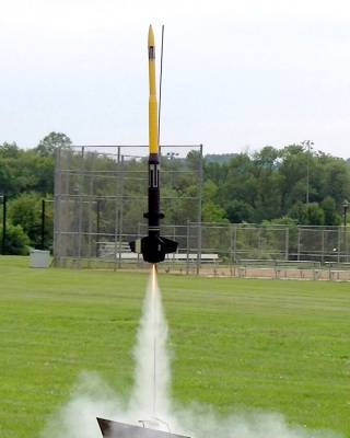 The Vector Force: The Vector Force is a modern Estes kit. This was my first model I made as a BAR. It had very good quality balsa fins on my kit, thick and sturdy. You can see the design is inspired by air defense missiles. It is rather tall, but somewhat heavy because of the two reducers. Because it has two reducer stages it has two separate payload tubes. Estes tells you to glue the payload tubes, but why? Good idea if you want to be sure the rocket doesn't separate in flight, but why waste two very nice payload bays? I just make sure they are always good and tight with some masking tape. Mine is painted school-bus yellow and gloss black to better match the included decals. I added about 3 heavy coats of clear coat for a really deep shine. String stability tests with a C motor required about 20-ish grams of nose weight, but now it flies really straight up - provided there is little wind. The top payload tube has vent holes for a barometric altimeter. I've recorded flights in excess of 400 feet with C6 motors. This is my current go-to flagship rocket. I have tried some test flights with composite D engines, to see if I could kick this puppy past 1000 feet. It sure did! In the process, the shock cord was torn out from the mount. This model was repaired by installing a custom ejection baffle with a Kevlar shock cord attachment. Now I think she'll hold up to a few more D-powered launches and ejections. This rocket has flown higher than the NY Times Building in NY, and also the Chrysler Building including the pinnacle, and the Bank of America Plaza in Atlanta.