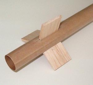 The shock cord made from a generous 25" piece of Kevlar® cord and a 24" piece of elastic. The fins are 1/8" thick balsa and require a single straight cut for each. The leading and trailing edges of the fins are rounded before they are attached to the body tube and then the 3.5" long, BT-80 ring fin is glued to them. The precut length of the fins was perfect for the tube fin to fit without any additional sanding. The base of the nose cone is glued to the nose cone top with CA and the shock cord tied to the nose cone.