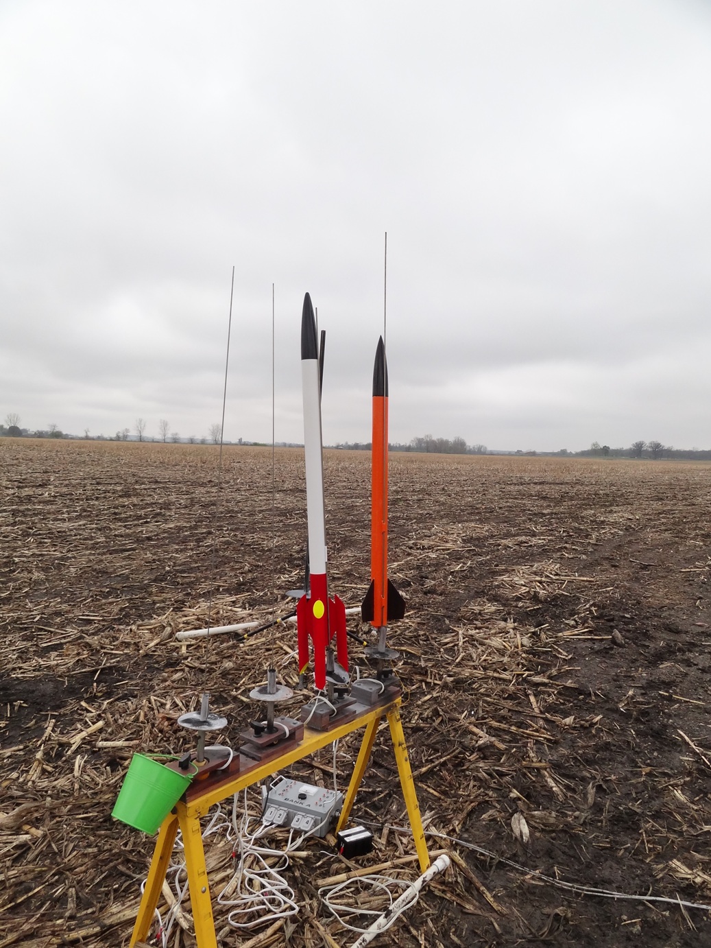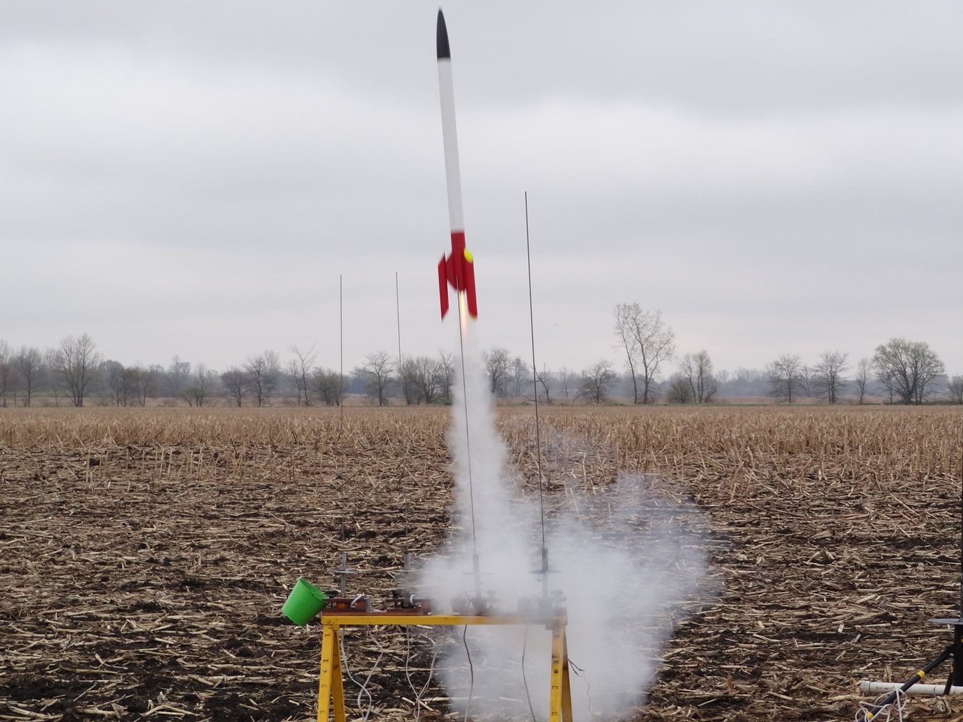 First flight. Windcocked to the left. Ejected at apogee and stuck the landing. (One of the tube find stuck in the wet cornfield, leaving the rocket at a 75 degree angle.)