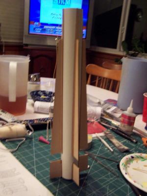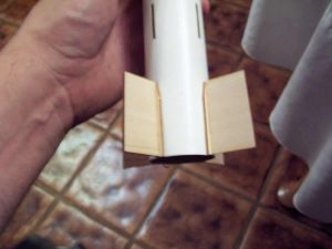 White the fins were drying, I decided to mount the motor assembly. I test fitted and sanded as needed to get a fit that was not too tight. A swab was used to run a ring of glue around the interior near the location of the forward centering rings. The mount was then pushed part of the way in and the swab was used to place another ring of glue. The motor mount was then pushed the rest of the way in. This must be done expeditiously so that you can get it all the way in and get the slots in the rings lined up with the slots in the airframe. If you miss by a little, it is not a great tragedy since a file or razor knife can be used to clean up any misalignment on the rings.