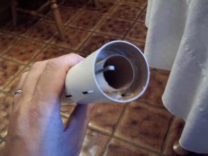 Construction begins with the motor mount. A slit is cut in the motor tube to accommodate the motor hook. The hook is then inserted and held in place by some masking tape.