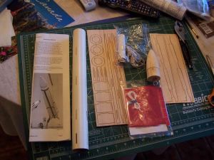 The fins were easy, too. They practically fell out of their sheets. I started with the aft fins. Each one is removed and has a tab to fit into a basswood plate, which itself has a notch. Little or no sanding was needed to make it fit. I glued the fins to the plates with yellow glue and used the corner of a steel ruler to make sure of the right angles. There is a subtle difference in shape between the forward end of the fin and the rear which might provide a gotcha. Just make sure that the narrower end is forward.